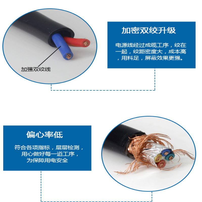 屏蔽层由镀锡铜线制成,可防止氧化;覆盖率十分相近90%,缩减了干扰并防止了使用过程中的误操作。